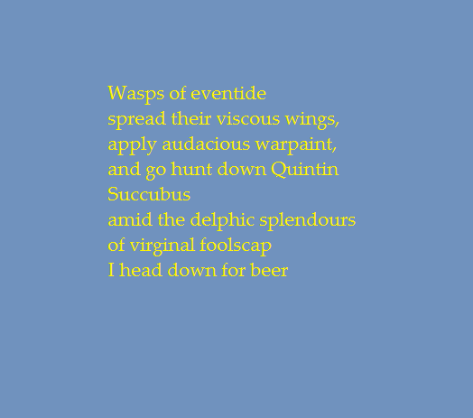 ...divined at last why fingers when flexed twinkle ; grown truly sick of naff reflection; noises off conspire to confound; unbled fucking radiators rage; absent mind drifts to dark arcadia; mourn dancing planets lost to soundbites; melancholy sunflowers snigger; limpid equine eyelids droop; molten magma tears flood fenlands; hairline fissure on the ocean; four squinting barracuda scatter; flying fishwives dissolve in bitchy gossamer; slope caught shoplifting by mantrap anchovy; collective conch shell earholes prick; bleached fine tooth back combed beehive sparkles; electrifying orchid sighting; touchpad static ocean tingle; giggle nervily giddy hooded; end of media for a twelvemonth day; never one to follow fashion; mores to boot and save a fortune; purchase rawl plugs unclear of conscience; epistles replace cheapshot missives; dreamy brave new worlds collapse; announce a sure solution to eye pollution; exhort perpetual indulgences of the ear; waxing lyrical brooks no doubt; blessed peace and quiet deafens; profaned by preposterous firesale plugs; fingerful of fofmaldehyde secrets; no go dip your wick in that; be careful with that wax eugenie; dunno where its been; a butterfly picks its nose in siam--and wham; sorry bob never was your uncle...