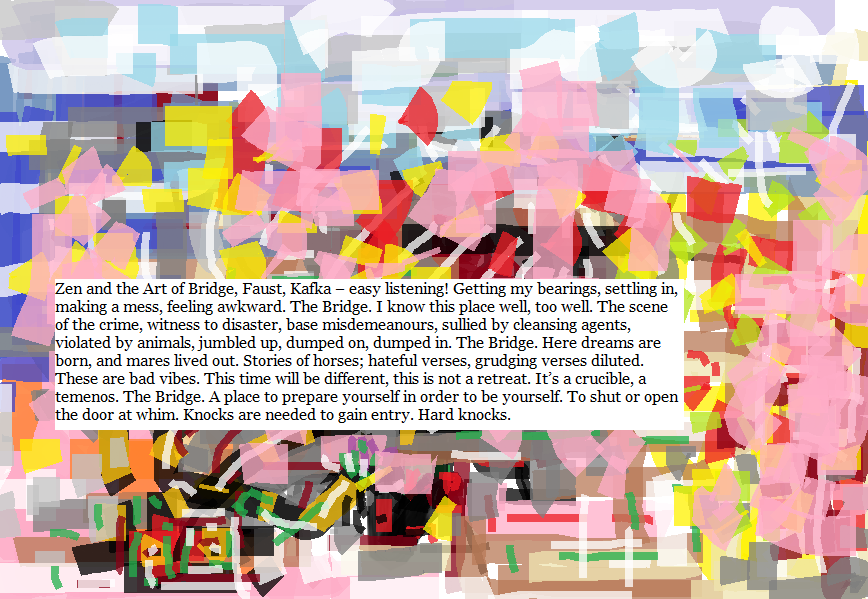 The Bridge. Here dreams are born, and mares lived out. Stories of horses; hateful verses, grudging verses diluted. These are bad vibes. This time will be different, this is not a retreat. It’s a crucible, a temenos.